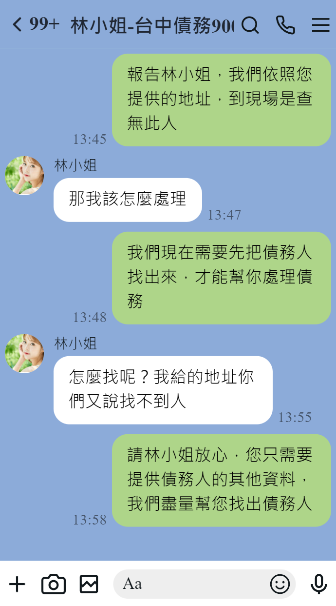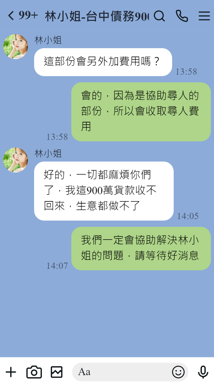 帳務催收問題是否讓您困擾不已?工商社會的現今,人與人、企業之間常存在著應收帳款問題,許多人與企業因為帳務催收、尋人討債等問題而導致自己陷入困境,您需要應收帳款-債務催收徵信社的專業協助;應收帳款-債務催收徵信社提供應收帳款問題解決,匯集優秀人才與律師顧問團隊成立,以豐富帳務催收經驗,配合專業律師的法律諮詢服務,協助委託人合法的解決應收帳款、尋人討債問題!